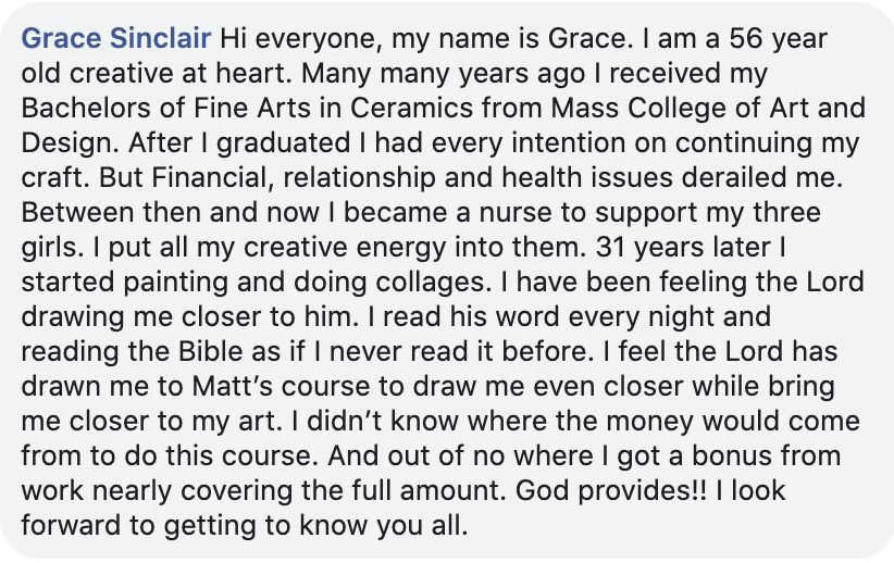 It's an opportunity for Christian Artists to learn how to thrive spiritually, artistically and in business as an artist in God's Kingdom. The best part? You'll be doing it while creating art and connecting with other Christian artists along the way!